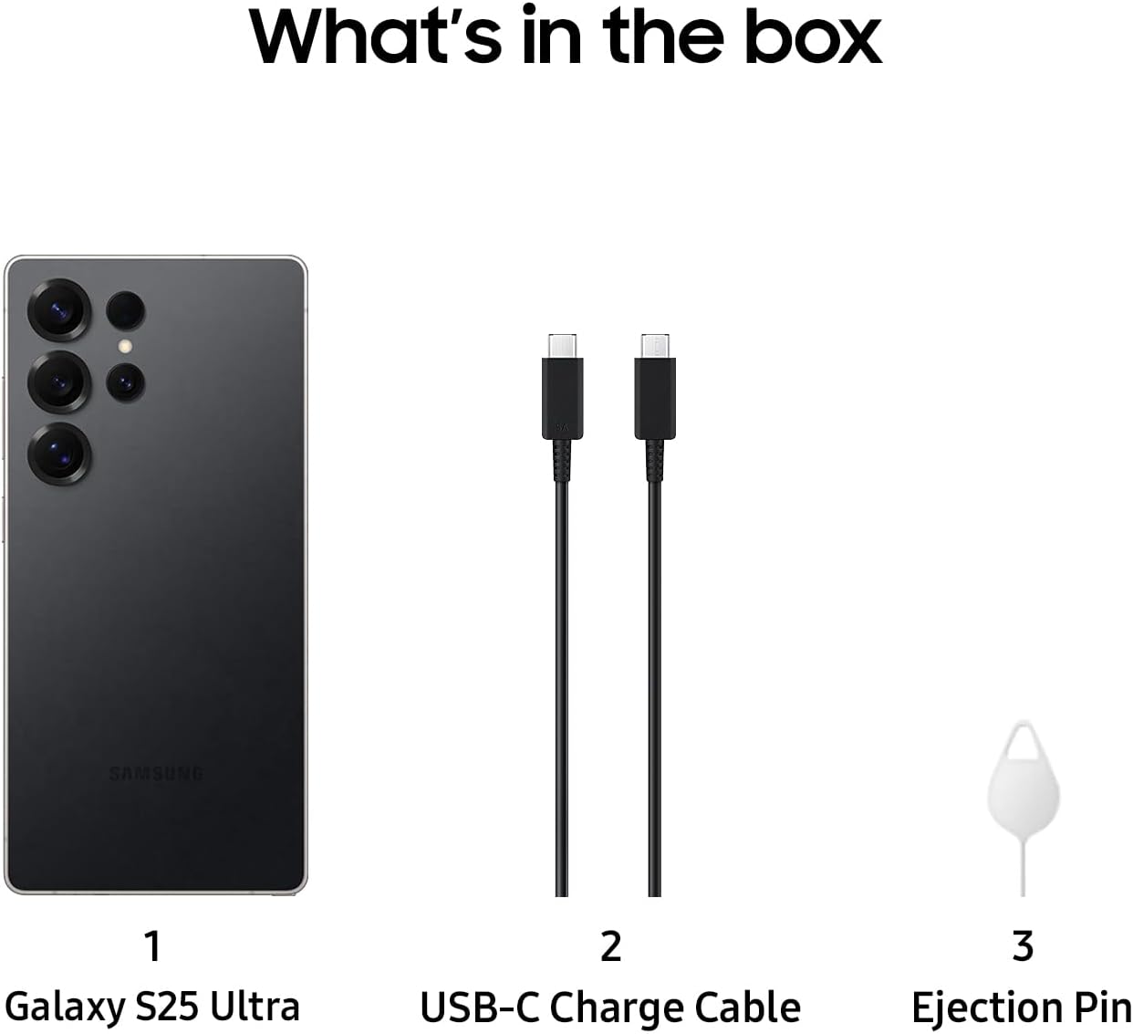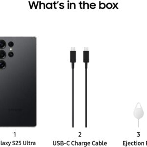 Samsung Galaxy S25 Ultra 5G 512 GB 12GB RAM GSM/CDMA Unlocked Phone Qualcomm SM8750-AB Snapdragon 8 Elite 200MP Network Technology GSM / CDMA / HSPA / EVDO / LTE / 5G Body Dimensions 162.8 x 77.6 x 8.2 mm (6.41 x 3.06 x 0.32 in) Weight 218 g (7.69 oz) Build Glass front (Corning Gorilla Armor 2), glass back (Gorilla Glass Victus 2), titanium frame (grade 5) Nano-SIM + eSIM + eSIM (max 2 at a time) - USA IP68 dust tight and water resistant (immersible up to 1.5m for 30 min) Stylus Display Type Dynamic LTPO AMOLED 2X, 120Hz, HDR10+, 2600 nits (peak) Size 6.9 inches, 116.9 cm2 (~92.5% screen-to-body ratio) Resolution 1440 x 3120 pixels, 19.5:9 ratio (~498 ppi density) Protection Corning Gorilla Armor 2 Always-on display DX anti-reflective coating Platform OS Android 15, up to 7 major Android upgrades, One UI 7 Chipset Qualcomm SM8750-AB Snapdragon 8 Elite (3 nm) CPU Octa-core (2x4.47 GHz Oryon V2 Phoenix L + 6x3.53 GHz Oryon V2 Phoenix M) GPU Adreno 830 Memory Card slot No Internal 512GB 16GB RAM, UFS 4.0 Main Camera Quad 200 MP, f/1.7, 24mm (wide), 1/1.3", 0.6µm, multi-directional PDAF, OIS 10 MP, f/2.4, 67mm (telephoto), 1/3.52", 1.12µm, PDAF, OIS, 3x optical zoom 50 MP, f/3.4, 111mm (periscope telephoto), 1/2.52", 0.7µm, PDAF, OIS, 5x optical zoom 50 MP, f/1.9, 120˚ (ultrawide), 0.7µm, dual pixel PDAF, Super Steady video Features Laser AF, Best Face, LED flash, auto-HDR, panorama Video 8K@24/30fps, 4K@30/60/120fps, 1080p@30/60/120/240fps, 10-bit HDR, HDR10+, stereo sound rec., gyro-EIS Selfie camera Single 12 MP, f/2.2, 26mm (wide), 1/3.2", 1.12µm, dual pixel PDAF Features HDR, HDR10+ Video 4K@30/60fps, 1080p@30fps Sound Loudspeaker Yes, with stereo speakers 3.5mm jack No 32-bit/384kHz audio Tuned by AKG Comms WLAN Wi-Fi 802.11 a/b/g/n/ac/6e/7, tri-band, Wi-Fi Direct Bluetooth 5.4, A2DP, LE Positioning GPS, GLONASS, BDS, GALILEO, QZSS NFC Yes Radio No USB USB Type-C 3.2, DisplayPort 1.2, OTG Features Sensors Fingerprint (under display, ultrasonic), accelerometer, gyro, proximity, compass, barometer Samsung DeX, Samsung Wireless DeX (desktop experience support) Ultra Wideband (UWB) support Circle to Search Battery Type Li-Ion 5000 mAh Charging 45W wired, PD3.0, 65% in 30 min 15W wireless (Qi2 Ready) 4.5W reverse wireless Product Dimensions 6.41 x 3.06 x 0.32 inches Item Weight 7.7 ounces Item model number SM-S938UZKEXAA Batteries 1 Lithium Ion batteries required. (included) OS Android 15, One UI 7 Connectivity technologies Bluetooth, NFC, USB, Wi-Fi GPS True Special features Always On Display, Built-In GPS, Fast Charging Support, Water Resistant, Wireless Charging Other display features Wireless Human Interface Input Buttons, Microphone, Touchscreen, Touchscreen with Stylus Support Scanner Resolution 2560 x 1440 Other camera features Front, Rear Audio Jack USB-C Form Factor Bar Color Titanium Black Battery Power Rating 5000 Milliamp Hours Phone Talk Time 37 Hours Whats in the box Quick Start Guide, SIM Tray Ejector, Samsung Galaxy S25 Ultra, Stylus, USB Cable Manufacturer Samsung Electronics Date First Available January 30, 2025 Memory Storage Capacity 1 TB Screen display size 6.9 Inches Ram Memory Installed Size 12 GB Battery Capacity 5000 Milliamp Hours Weight 7.69 Ounces